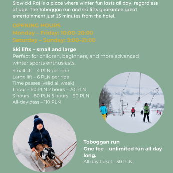 Just a few minutes from the hotel, Sławicki Raj awaits - a place where winter fun knows no age limits and energy never runs out. A toboggan run and ski lifts make it easy to enjoy an active day outdoors, whether it’s your very first steps on the snow or joyful family downhill rides. It is the perfect complement to a winter holiday stay in Dosłońce for those who wish to combine relaxation with a true winter adventure.