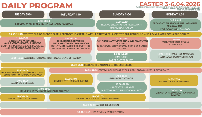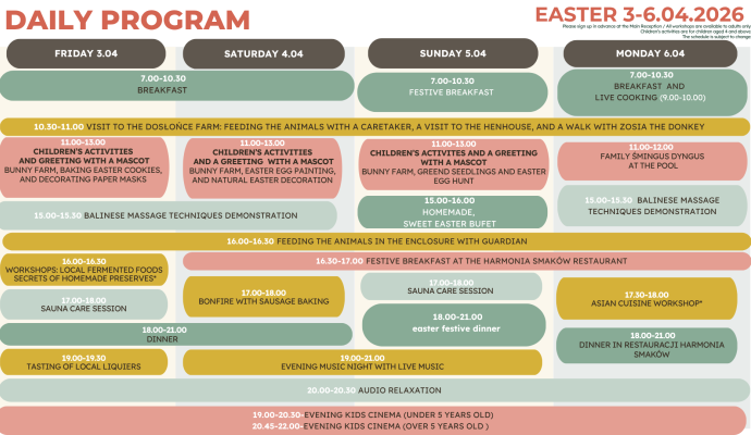 Spend an unforgettable Easter 2026 at Dosłońce Resort Wellness & Farm — a picturesque hotel in Małopolska, where tradition meets modern comfort. We offer a unique blend of family-friendly attractions, local cuisine, and relaxation surrounded by nature. Our Harmonia Smaków restaurant will treat you to festive dishes prepared with locally sourced ingredients, homemade preserves, and freshly baked specialties.