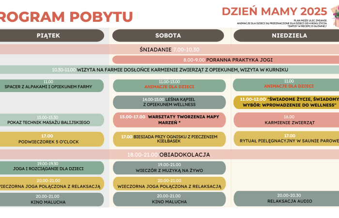 W dniach 23–25 maja przygotowaliśmy specjalny weekendowy program, pełen inspirujących aktywności, relaksu i zdrowych przyjemności. To idealna okazja, by zadbać o siebie – ciało, umysł i duszę – w kobiecym gronie i pięknym otoczeniu.